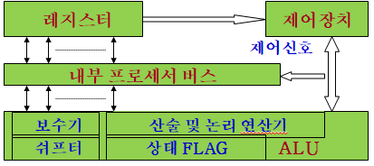 제어장치, 연산장치, 레지스터와 데이터 버스로 구성된다.