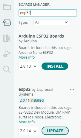 좌측 상단 2번째 board manager를 켜면 esp32가 있고 그걸 install해주면 됩니당.