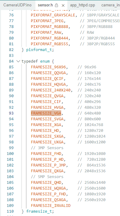sensor.h에 들어가보면 FRAMESIZE가 enum으로 정의되어 있고, 원하는 해상도를 선택해서 코드에 넣어주면 적용가능함.
