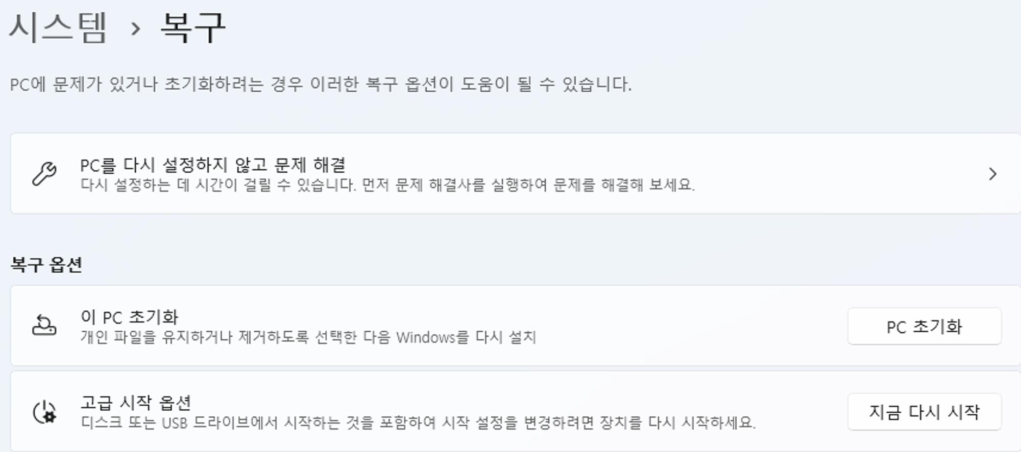문제해결→고급옵션→UEFI 펌웨어 설정→다시시작