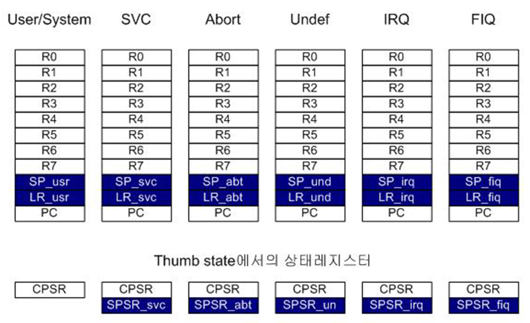 6. Undefined Mode => ARM이 정의되지 않은 명령을 수행하려고 하면 수행되는 프로세서의 동작 모드