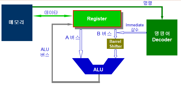 8개의 범용 레지스터 (R0~R7) , {R13(SP),R14(LR),R15(PC)}=>{연산명령에서는 사용불가}