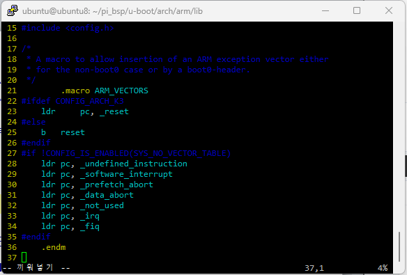 ubuntu@ubuntu8:~/pi_bsp/u-boot/arch/arm/lib$ vi vectors.S