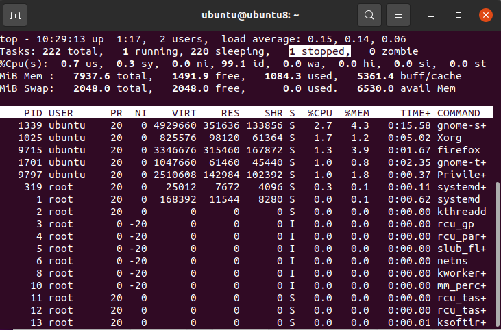top 명령어를 쳐서 확인해보면 stop된게 확인이 되
