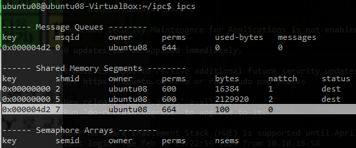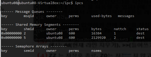 그래서 sleep을 넣어줘서 10초 동안 남겨주고 ipcs로 빠르게 확인해볼게여