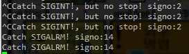sig int는 ctrl +c에 의해서 발생되는거고 번호는 2번, sigalrm은 alarm에 의해서 발생되고 번호는 14번임.