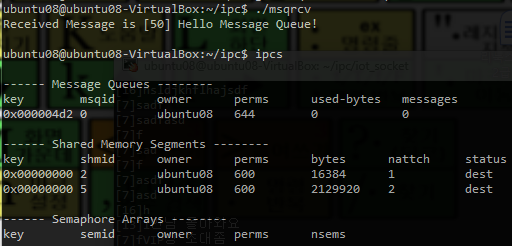 그 상태에서 ./messagequeue를 해주면 msqrcv 수신되면서 종료됨.