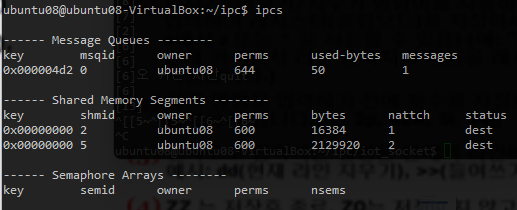그래서 sleep을 넣어줘서 10초 동안 남겨주고 ipcs로 빠르게 확인해볼게여