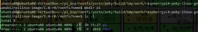 ubuntu08@ubuntu08-VirtualBox:~/pi_bsp/rootfs/yocto/poky/build/tmp/work/raspberrypi4-poky-linux-gnueabi/rpilinux-image/1.0-r0/rootfs$ cd home/pi/