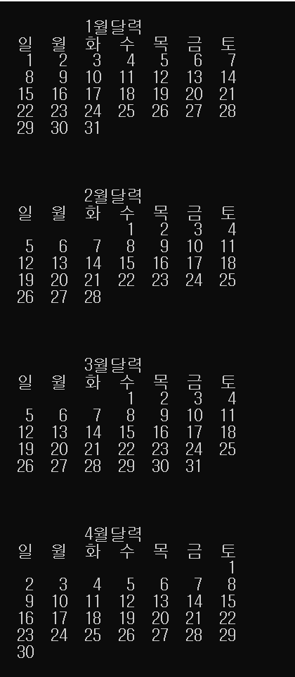 printf("\n%10s%d월달력%10s\n", "",i+1,"");
