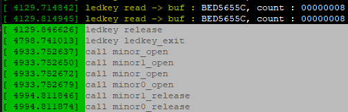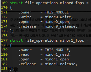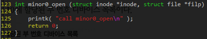 커널 메시지를 보면 주번호 파일포인터 열고, 부번호1 파일포인터 열고/ 주번호 파일포인터 열고, 부번호0 파일포인터 열고 순으로 진행됨.