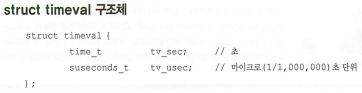 ![]() 시간을 설정하거나 시간을 얻기 위해 사용되는 구조체, tv_sec은 현재 시간을 초로 계산하여 처리하는데 사용되고, tv_usec은 tv_sec에서 짤리는 작은 값들을 처리하는데 사용 |