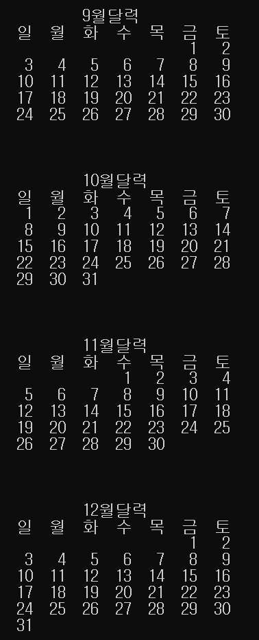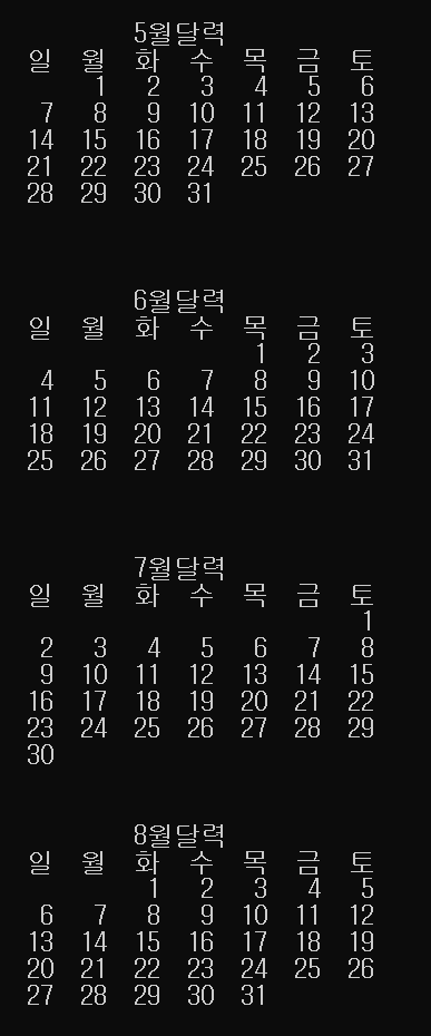 printf("\n%10s%d월달력%10s\n", "",i+1,"");