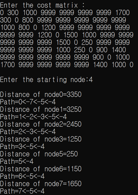 printf("\nDistance of node%d=%d", i, distance[i]);