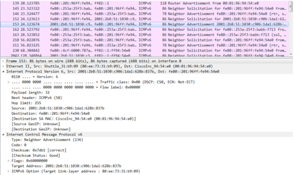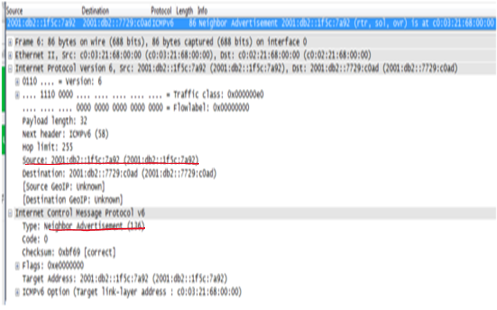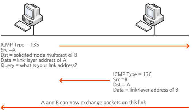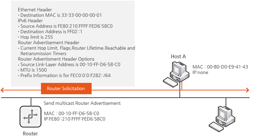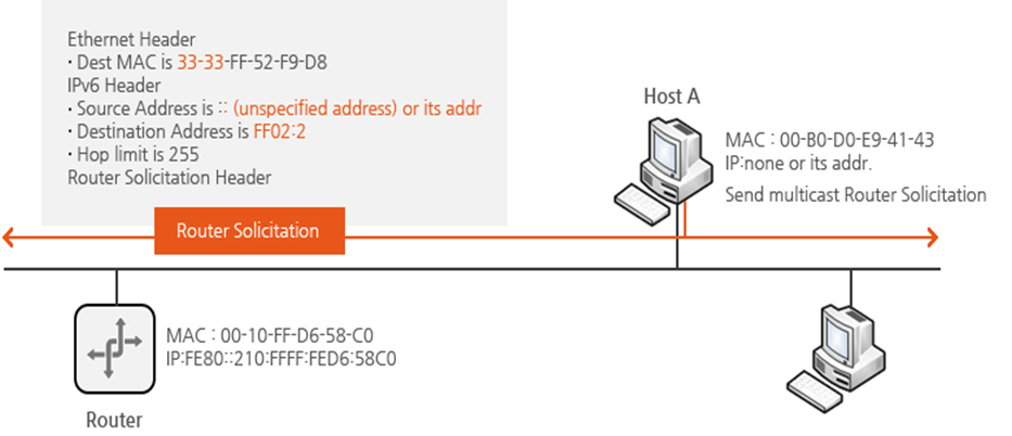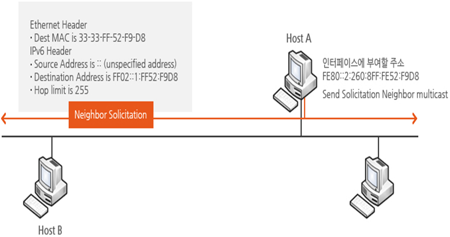 호스트 A는 EUI-64포맷을 바탕으로 링크 로컬 주소를 생성하고 이 주소에 대한 DAD과정을 수행하기 위해 NS 메시지를 전송한다. 이때 NS 메시지의 출발지 IPv6는‘::’(미 확정 주소)를 사용하며, 목적지 주소는 자신이 부여할 FE80::2:260:8FF:FE52:F9D8를 기반으로 한 FF02::1:FF52:F9D8 solicited node multicast 주소를 보낸다.