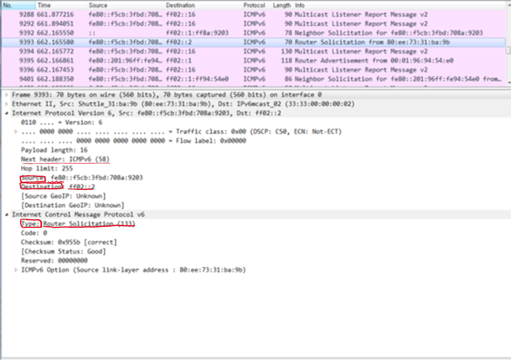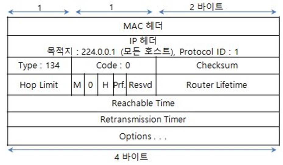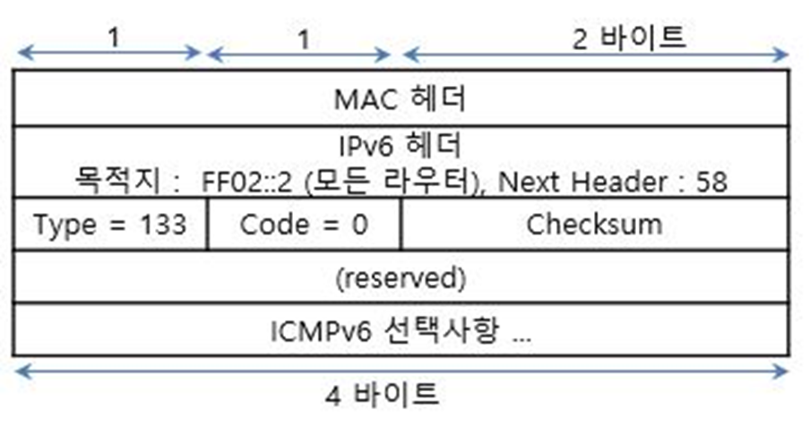 - 목적지 IPv6 주소 : FF02::2 (모든 라우터)