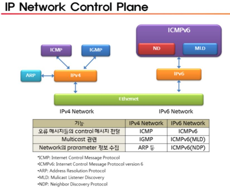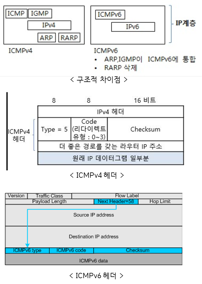 ICMPv4와 ICMPv6는 기본적으로 유사하나 구조적으로 달라진 점은 ARP,IGMP가 ICMPv6에 통합되었다는 것이고 RARP가 없어졌다는 것입니다. 기능적으로 달라진 부분은 Destination Unreachable, Echo Request와 같은 기본적인 error message는 type number가 바뀌었다는 것입니다. Neighbor Discovery와 관련 기능을 지원하기 위해 새로운 type과 code가 추가되었습니다.