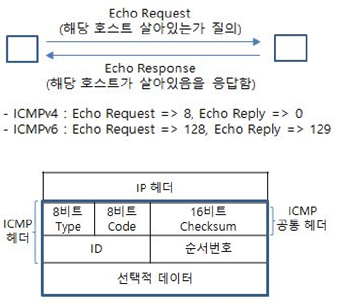- 인터넷상의 어떤 호스트가 제대로 동작하고 있는지 확인하기 위해 Echo Request 메세지를 보내면 해당 호스트는 이에 대한 응답으로 Echo Reply 메세지를 보냄