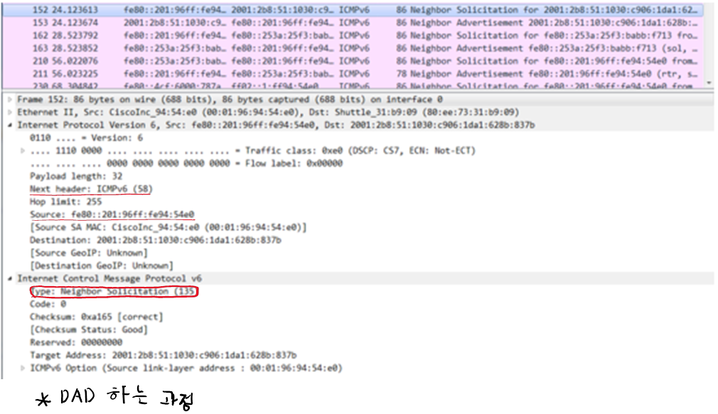 호스트 A는 EUI-64포맷을 바탕으로 링크 로컬 주소를 생성하고 이 주소에 대한 DAD과정을 수행하기 위해 NS 메시지를 전송한다. 이때 NS 메시지의 출발지 IPv6는‘::’(미 확정 주소)를 사용하며, 목적지 주소는 자신이 부여할 FE80::2:260:8FF:FE52:F9D8를 기반으로 한 FF02::1:FF52:F9D8 solicited node multicast 주소를 보낸다.