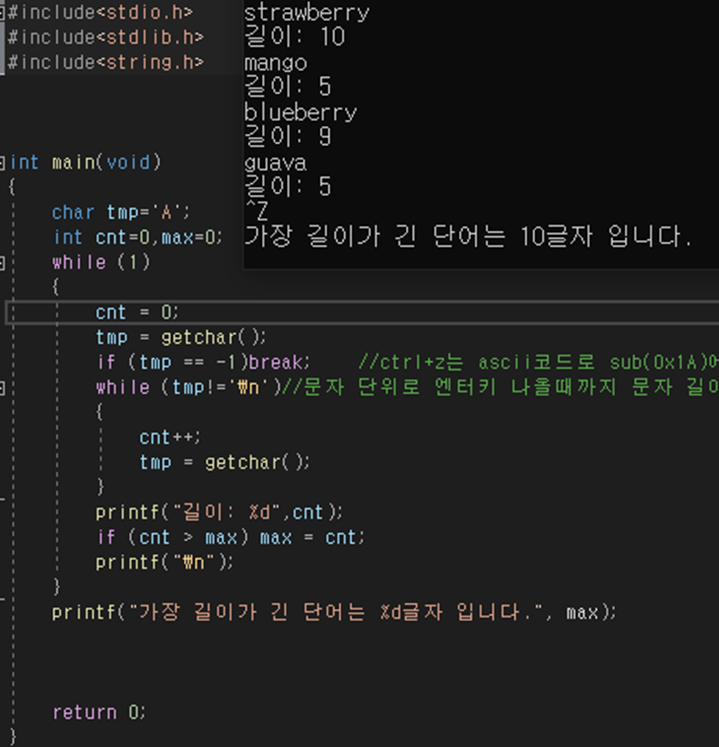 혼자공부하는 C언어 P343 도전실전예제(길이가가장긴단어)