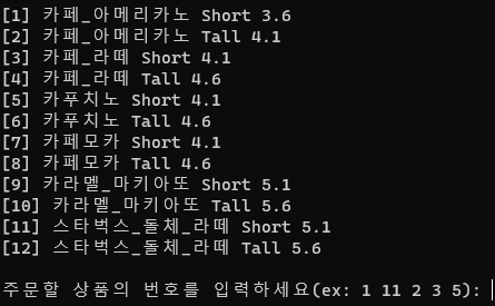 cout << "\n주문할 상품의 번호를 입력하세요(ex: 1 11 2 3 5): ";