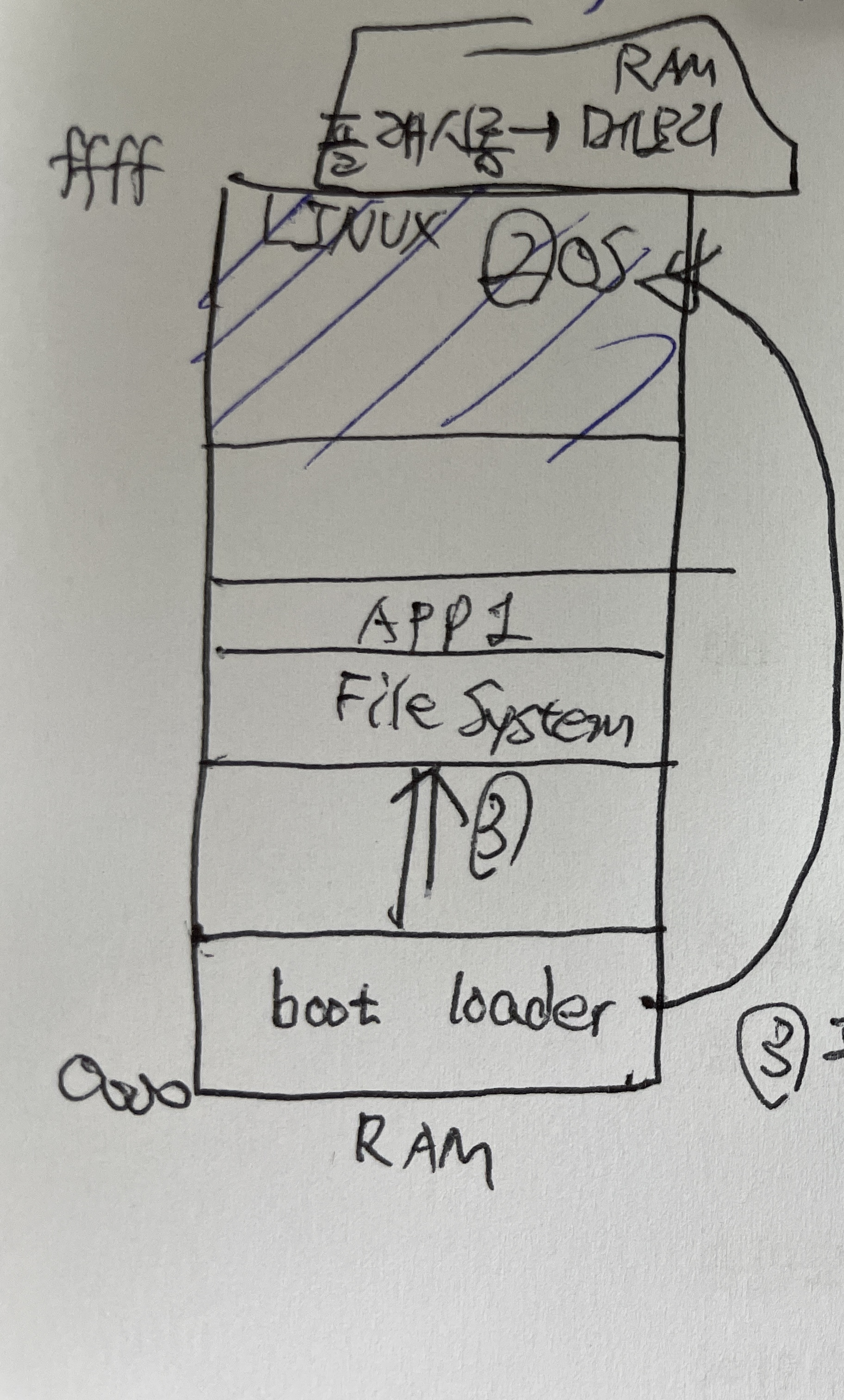 | 1.Flash ROM에 위치한 Boot Loader를 RAM 으로 올린다. 2. kernel로 os를 RAM에 올린다 3. File System을 올려야 함. |