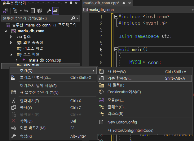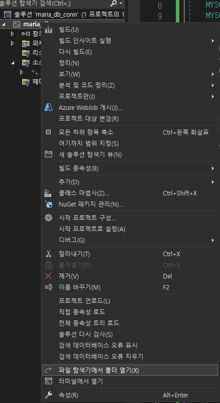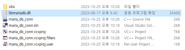 libmariadb.dll 파일을 프로젝트 솔루션이 있는 폴더 내부로 복사해줍니다.