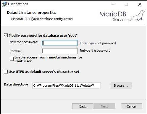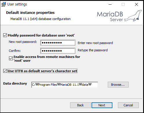 자 여기 중요한데 user id가 root이고 password를 설정해주는 과정입니다.