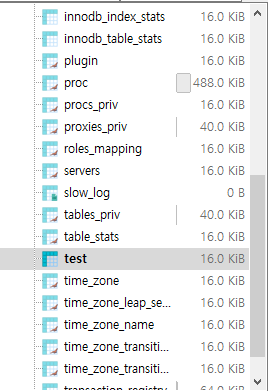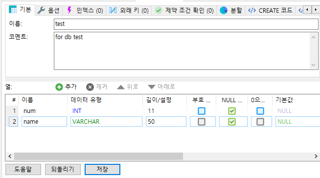 만들어준 test 이름으로 새로운 테이블이 생성된 것을 확인 할 수 있다.