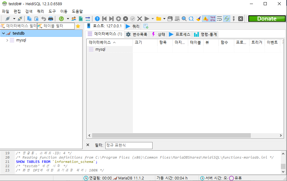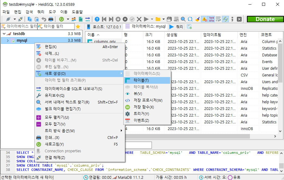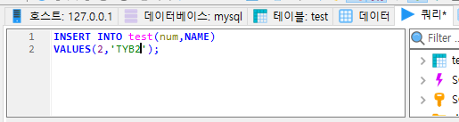 쿼리를 눌러 들어간 후 해당 sql문을 입력하고 실행시킨다.(재생버튼 클릭 or F9)