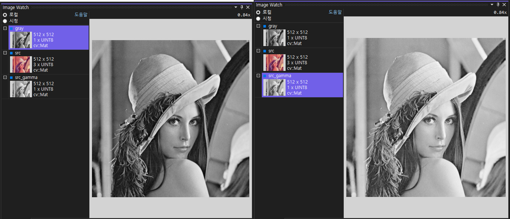 만약 어두운 걸(0.2에 해당하는 정보정도) 밝게 하고 싶다면 gamma=1에서 0.4로 바꾸면 출력이 0.55정도로 늘어나게됨.