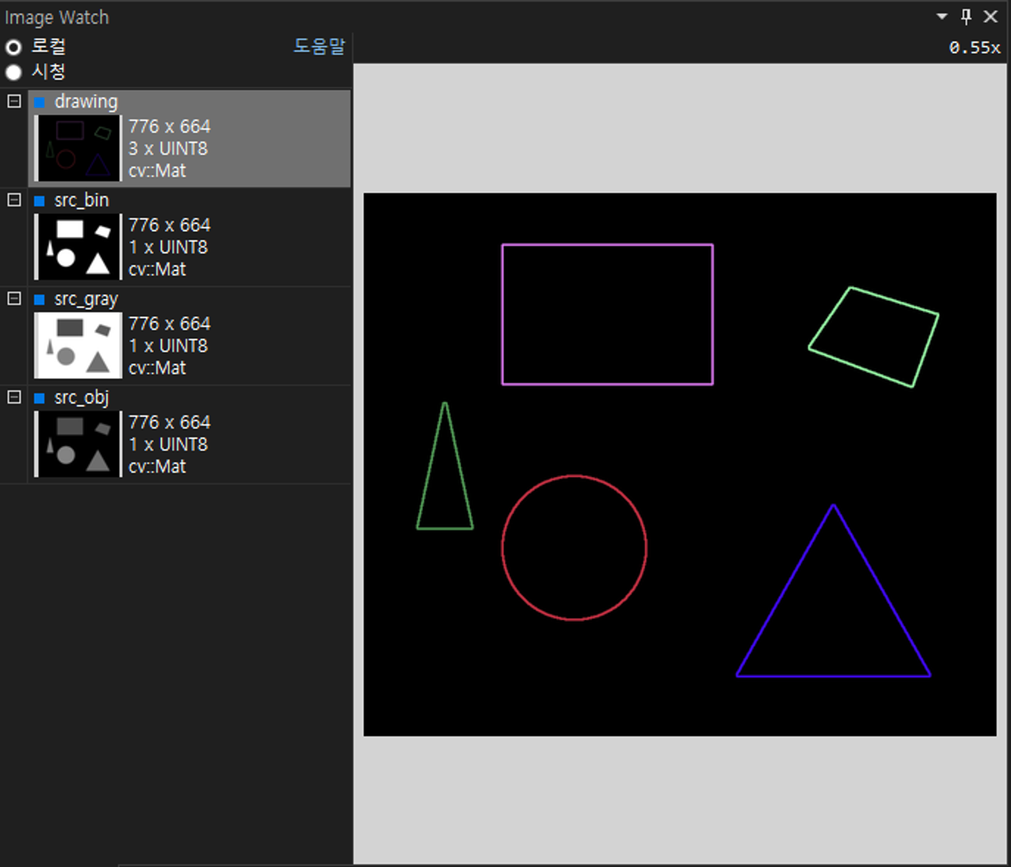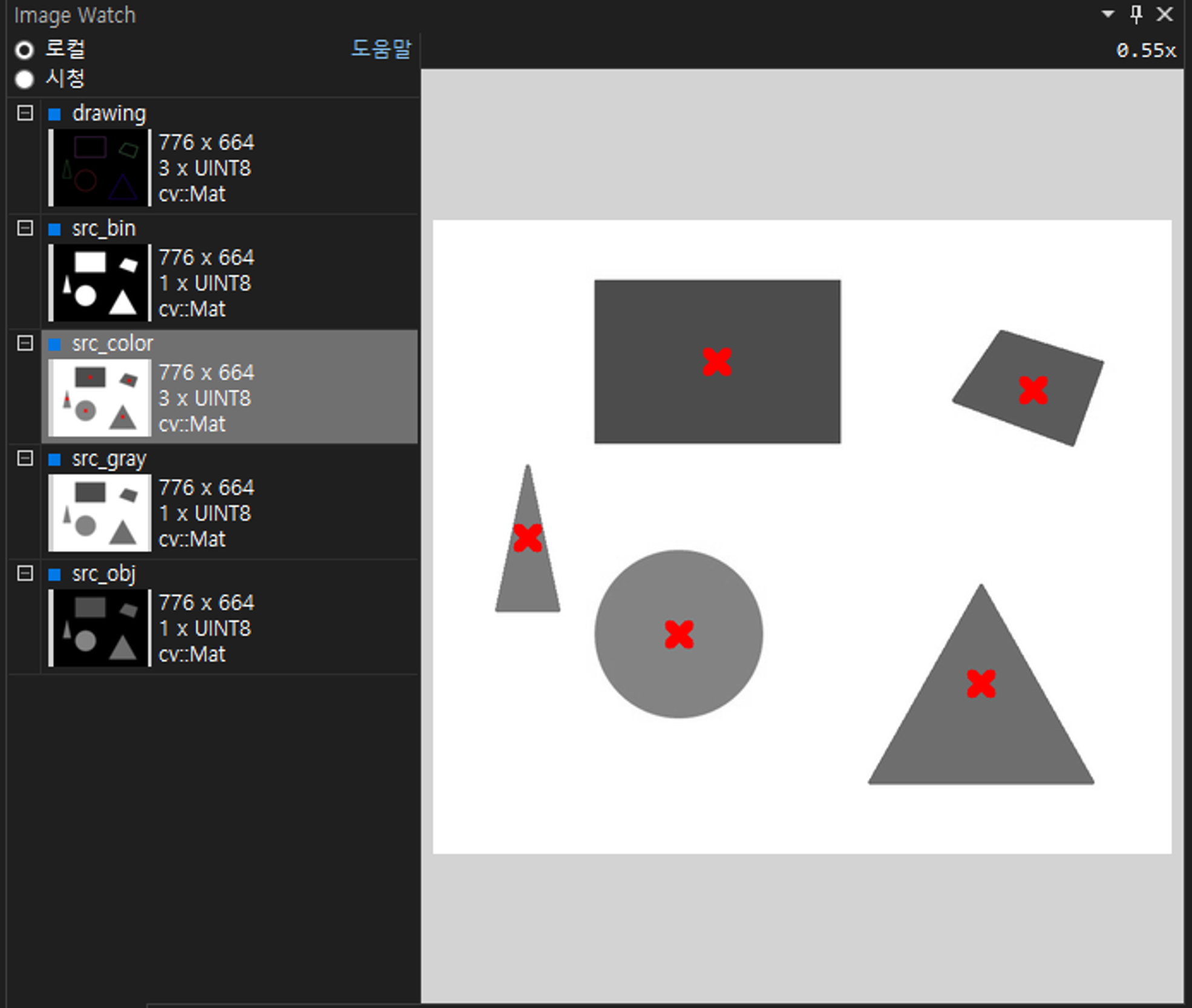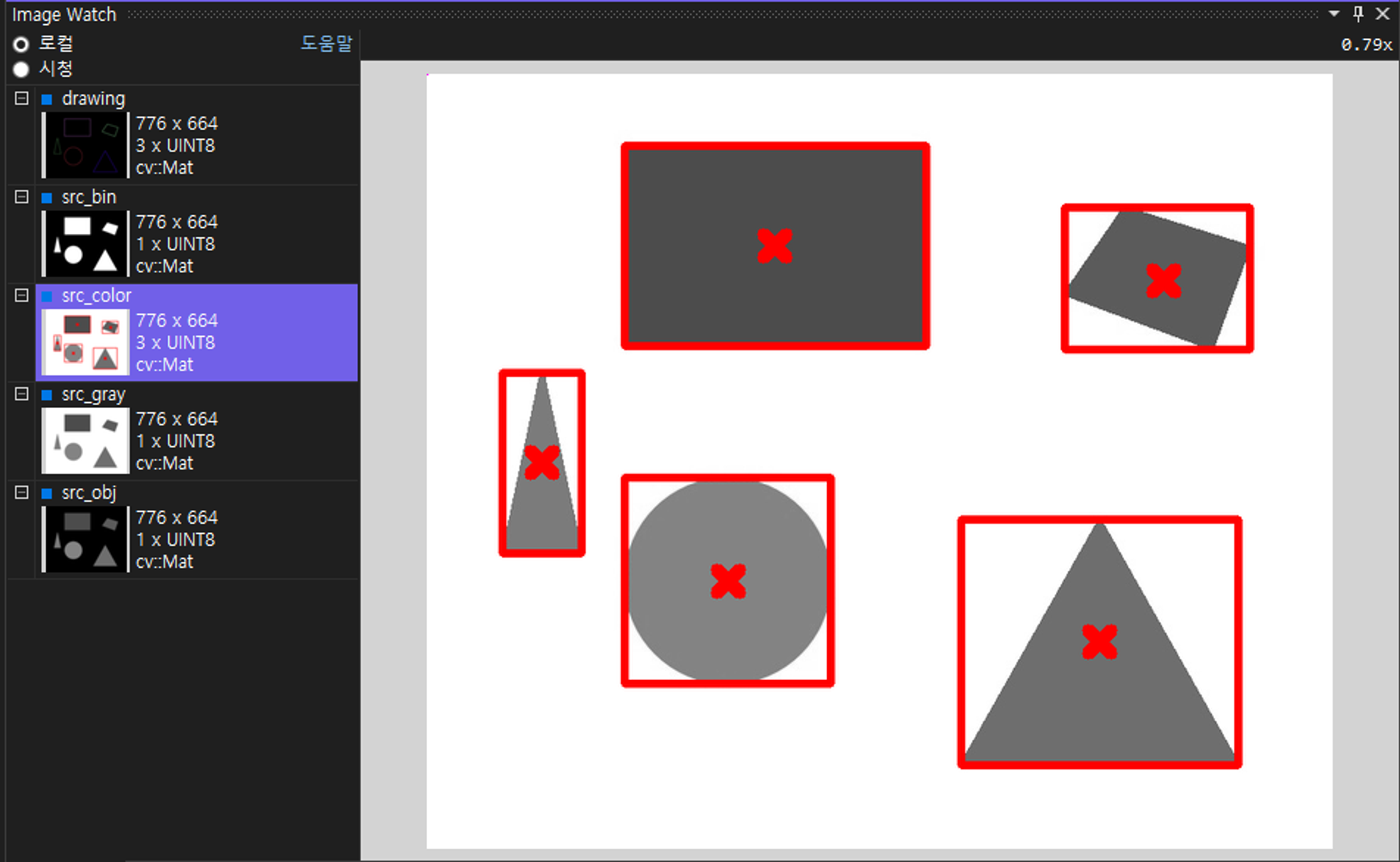 아래 코드 추가해주면 저렇게 도형의 가운데 점 Center Of Gravity X , Y 를 구한 후 X모양으로 표현해주는 것을 볼 수 있다.