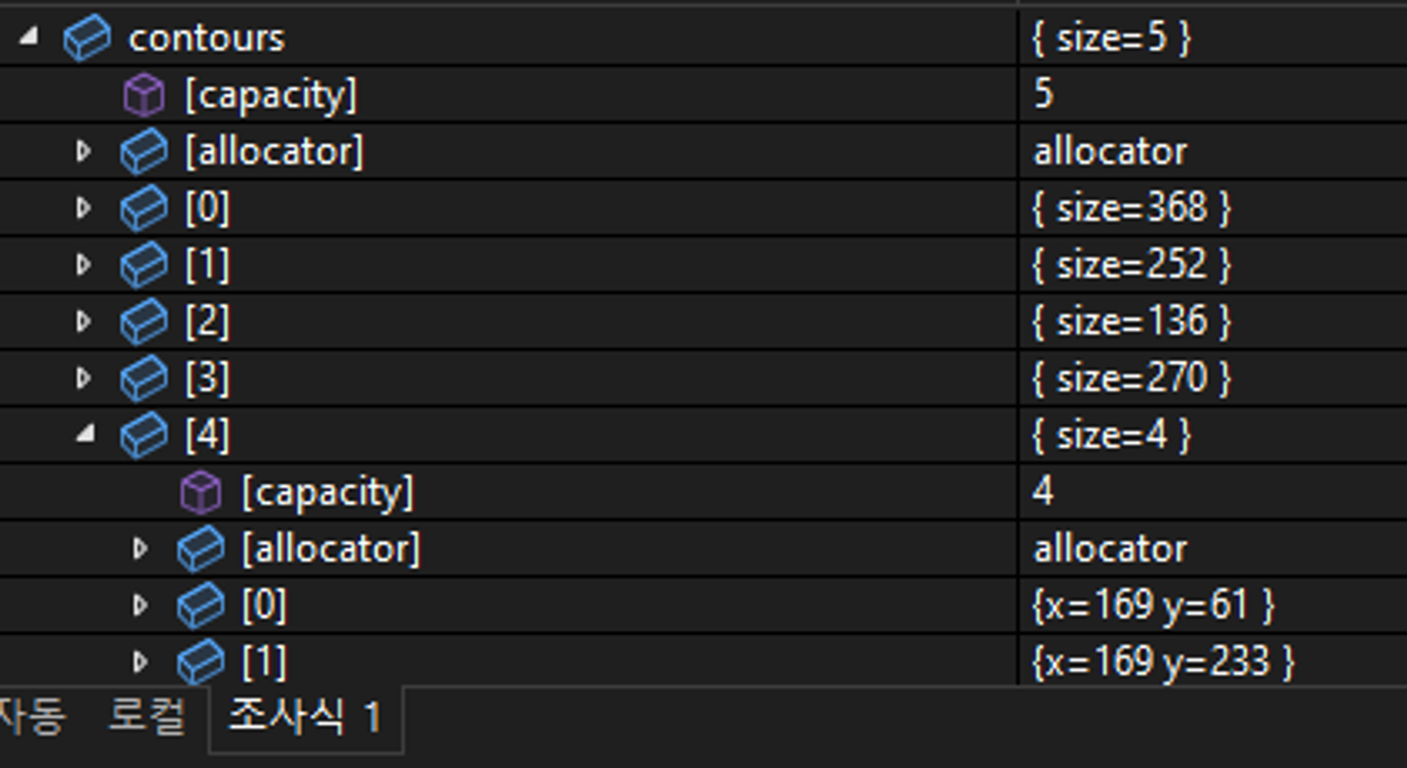 std::cout << i+1 << "번째 contours point 갯수: " << contours[i].capacity() << std::endl;//int= 4Byte /Point=2*int = 8Byte
