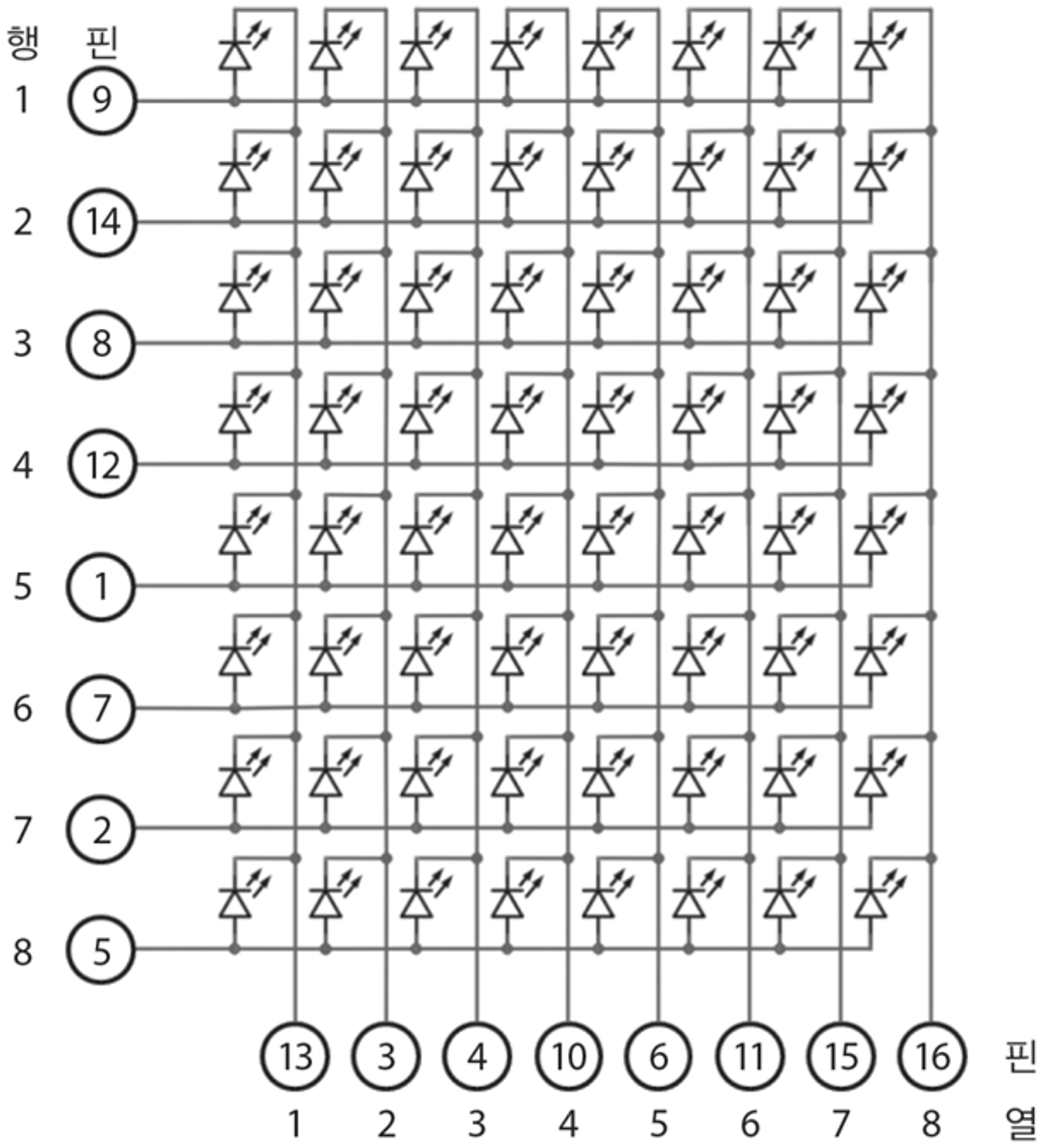 위 그림의 핀의 숫자는 모듈의 물리적인 핀 번호를 의미함. 행은 실제 매트릭스에 표시되는 행이나 열을 의미함.