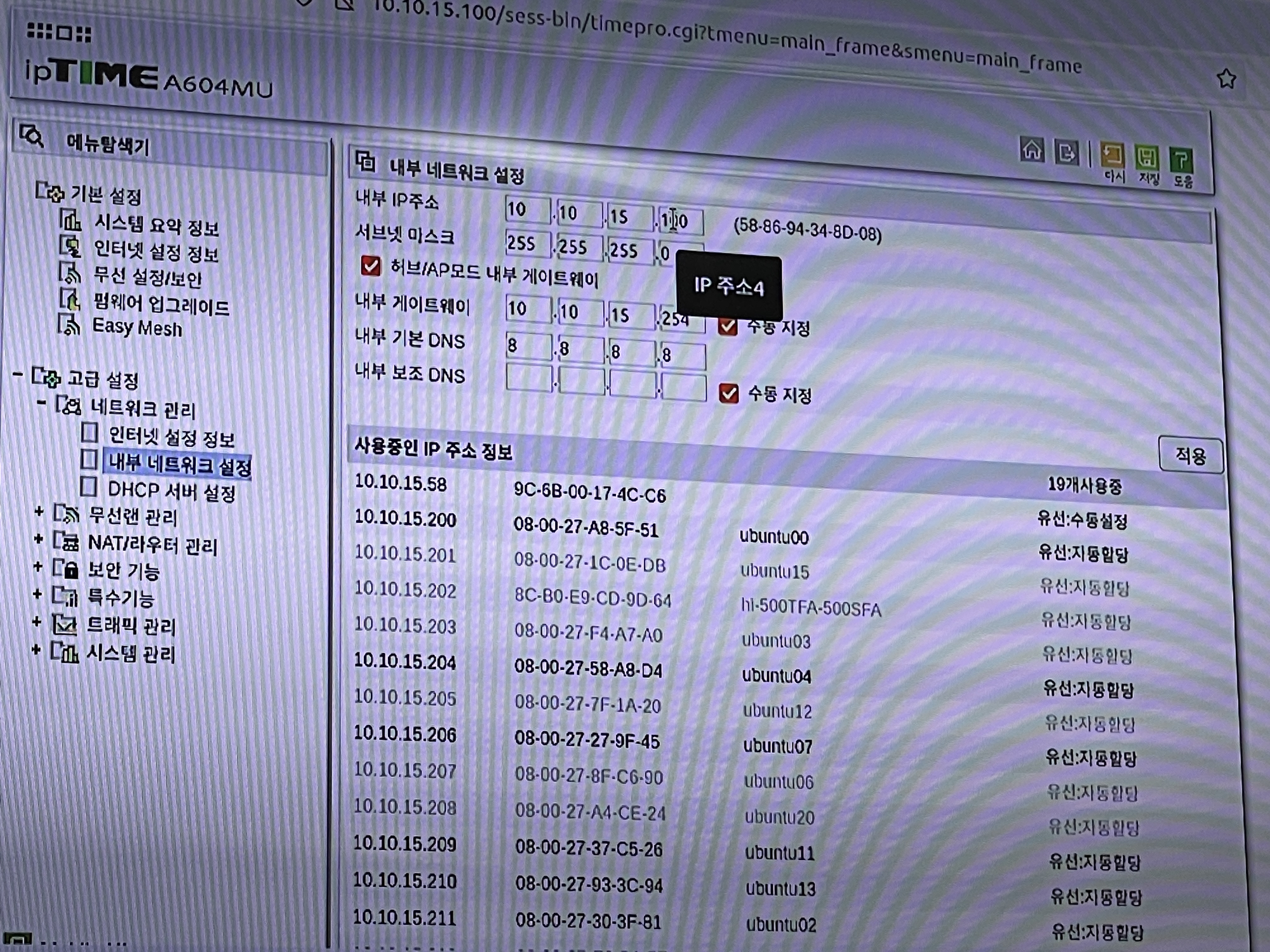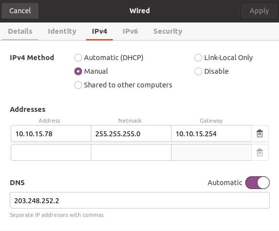 네트워크 설정을 위처럼 해주면 DHCP 허브로부터 Manual하게 ip를 고정시켜 사용할수 있다.