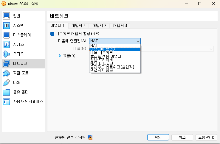 dhcp 공유기를 하나 허브 모드로 세팅해주면 자동으로 가상환경의 네트워크가 잡힘. 그러나, dhcp로 설정해놨기 때문에 접속할 때 마다 ip가 바뀜. 그러니 우분투 내에서 이따가 고정 ip로 변경해주면 좋음.