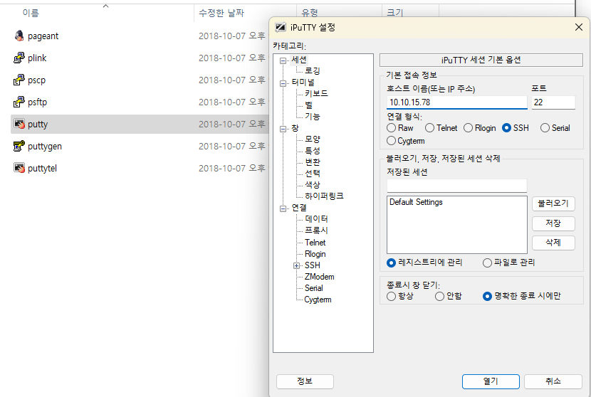 윈도우에서 putty를 다운받아서 실행 후 linux의 ip입력