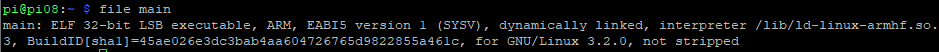 main: ELF 32-bit LSB executable, ARM, EABI5 version 1 (SYSV), dynamically linked, interpreter /lib/ld-linux-armhf.so.3, BuildID[sha1]=45ae026e3dc3bab4aa604726765d9822855a461c, for GNU/Linux 3.2.0, not stripped