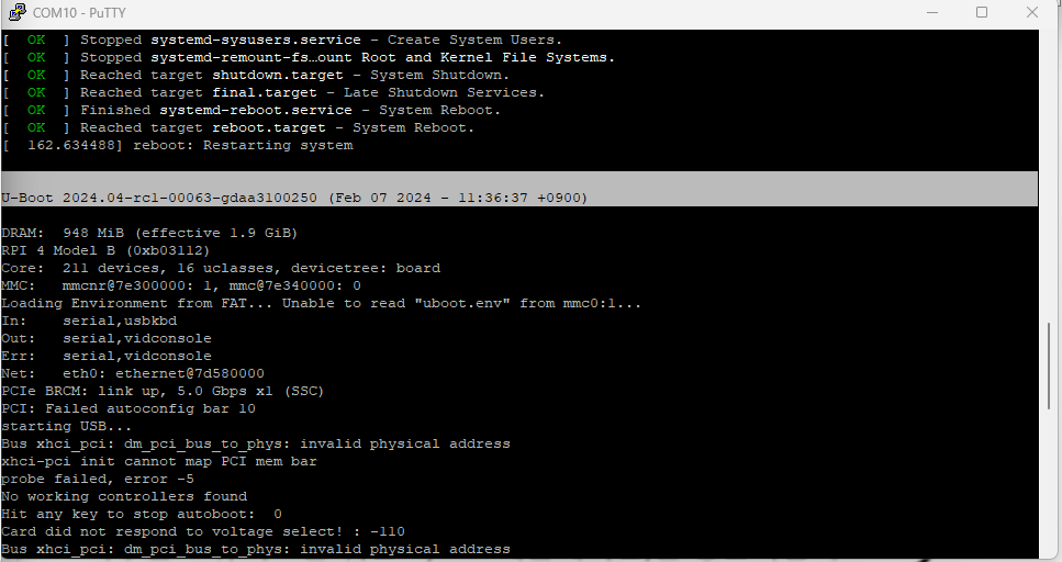 U-Boot> reset //재부팅